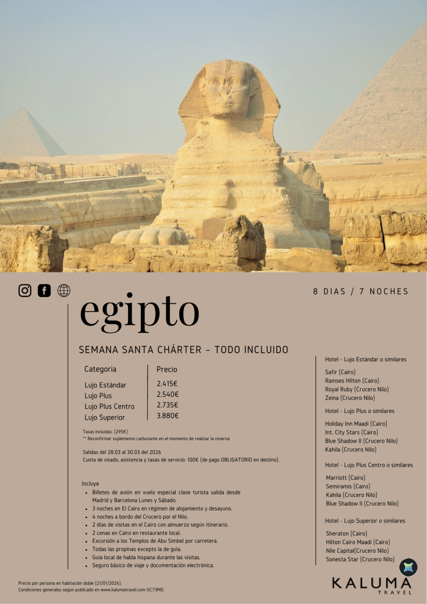 Egipto Especial Semana Santa 8 noches - Charter Todo Incluido desde Barcelona y Madrid desde 2.415€